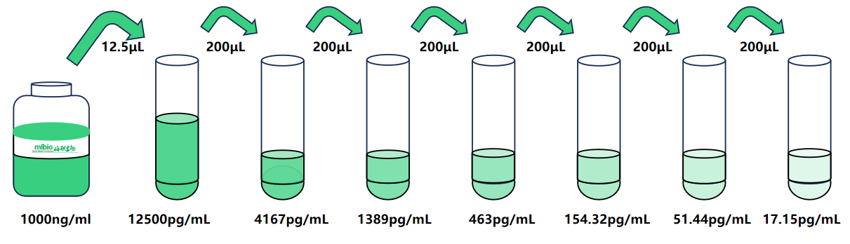 試劑盒中取出標準品,準備7個試管,先將1000ng/mL標準品(200µL)按需吸取一定量用1×稀釋液稀釋至12500pg/mL(例:12.5µL的標準品母液+987.5µL的1×稀釋液,制備得到1000μL的12500pg/mL濃度標準品),隨后在6個試管中分別加入400μL的1×稀釋液,在這6個單獨的試管中將12500pg/mL標準品依次3倍倍比稀釋至7個梯度,共配制7個濃度的標準品,依次為:12500pg/mL、4167pg/mL、1389pg/mL、463pg/mL、154.32pg/mL、51.44pg/mL、17.15pg/mL,從最高濃度標準品溶液中吸取200μL標準品到下一個試管中,輕輕吹打混勻,以此類推進行標準品的倍比稀釋(如圖所示),1×稀釋液用作零濃度標準品(0pg/mL)。